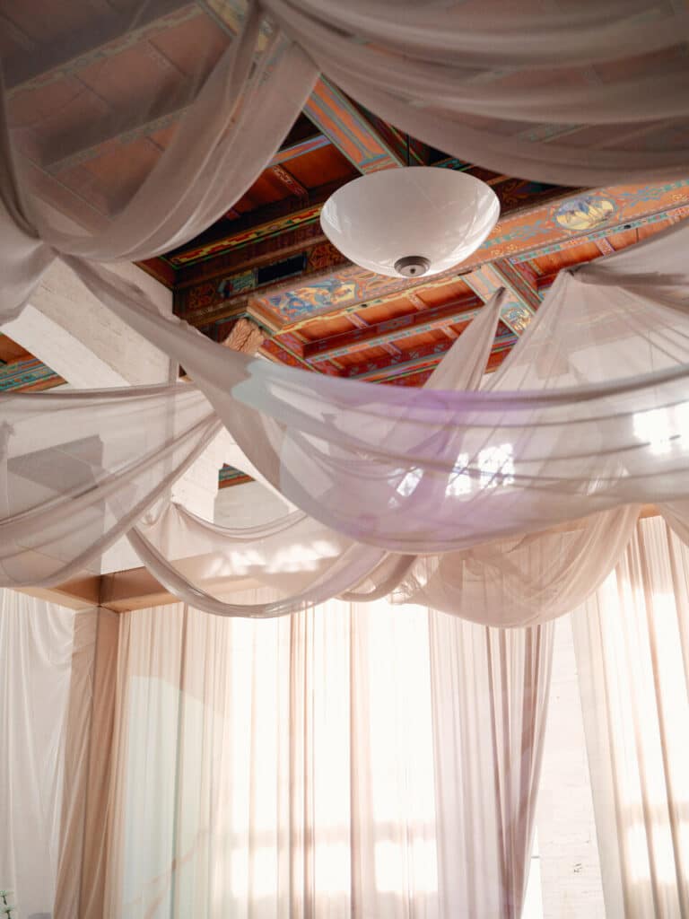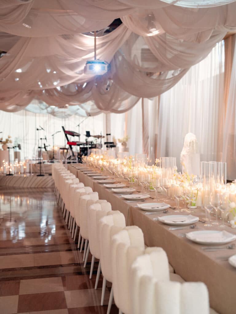 Designers are now treating ceilings and overhead spaces as vital parts of decor. Draperies, suspended florals, sculptural installations, and even light fixtures are becoming focal points that frame the entire event environment.
