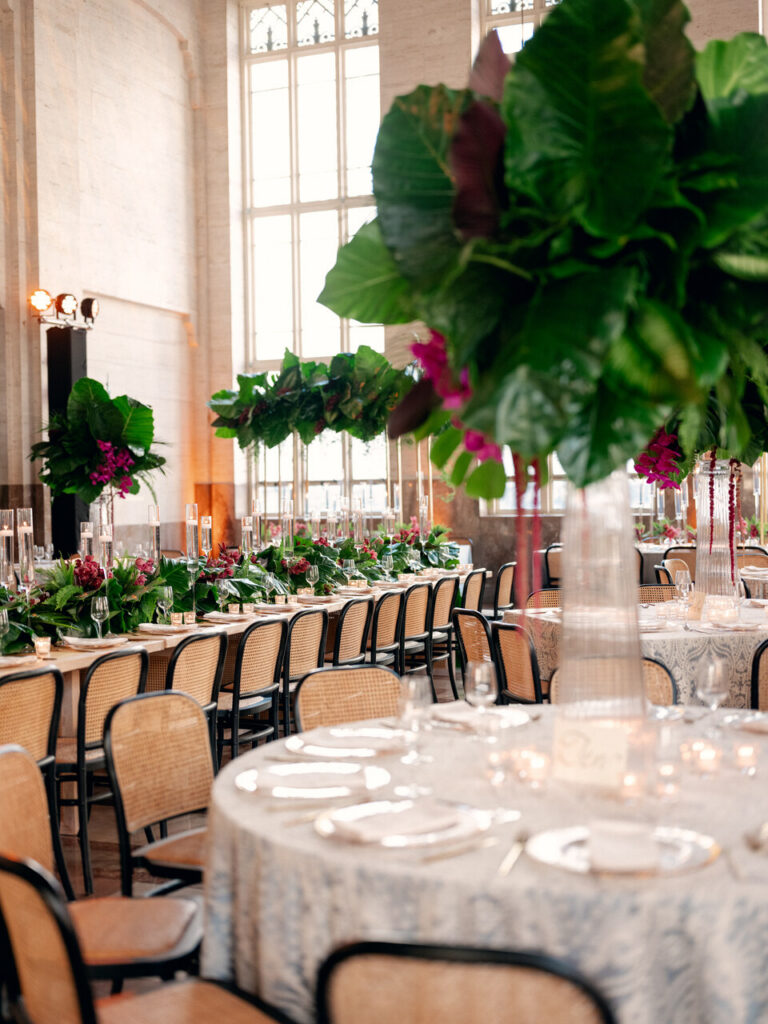 A tropical dark wedding theme combines lush oversized greenery with deep tones and candlelight to create a dramatic yet refined aesthetic.