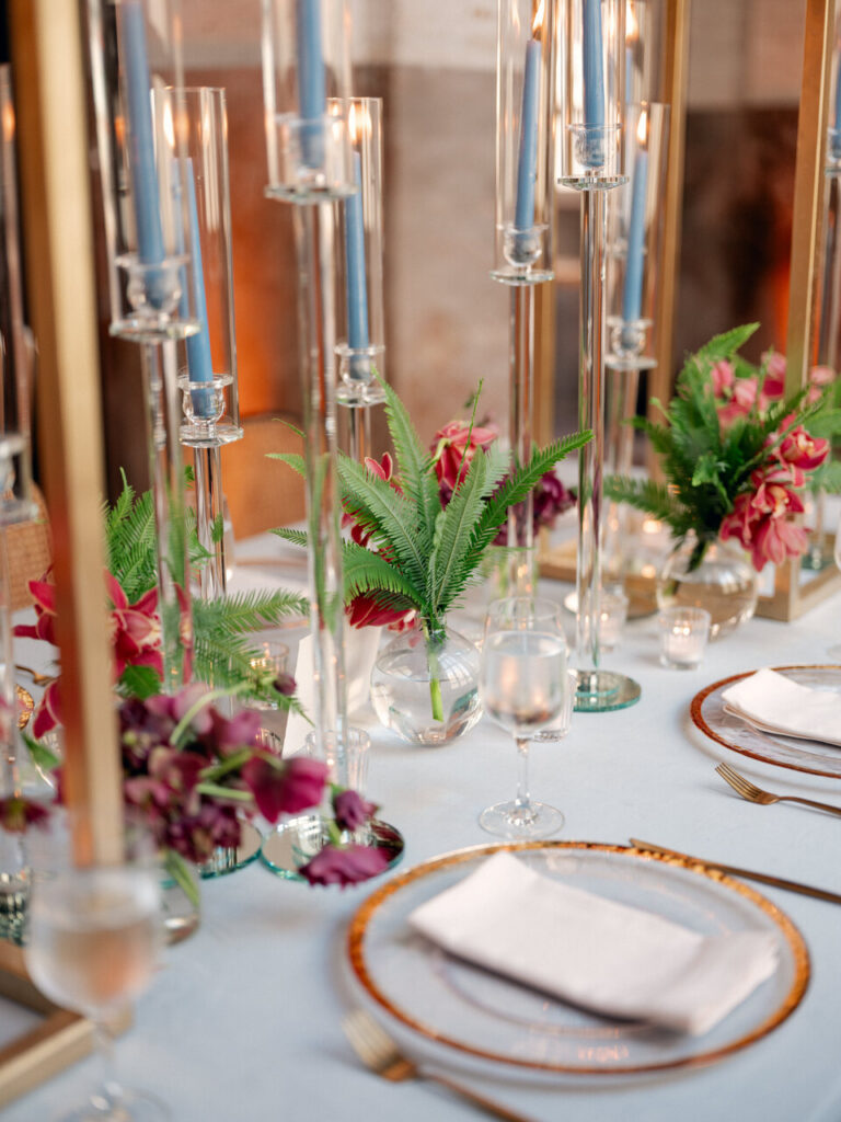 Instead of beachy tones, this theme pairs oversized greenery with deep emerald palettes and candlelit installations.