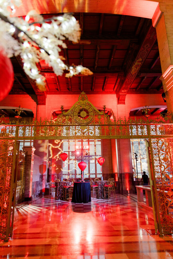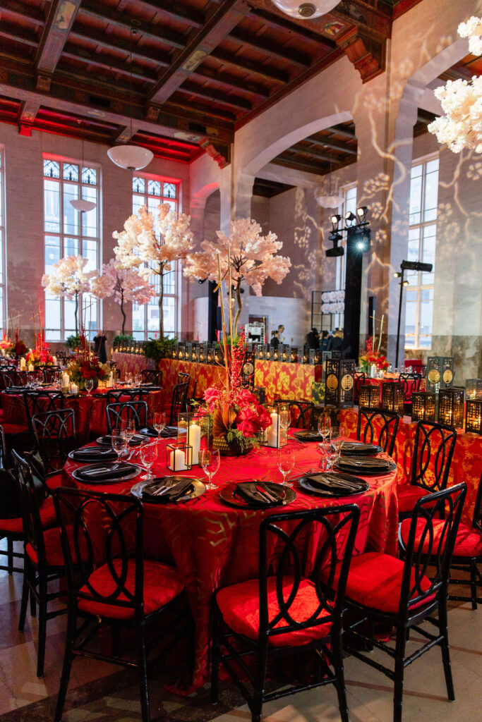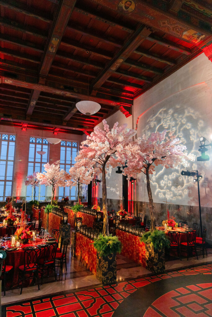 This bold romantic red glam wedding theme creates visual impact through abundance.