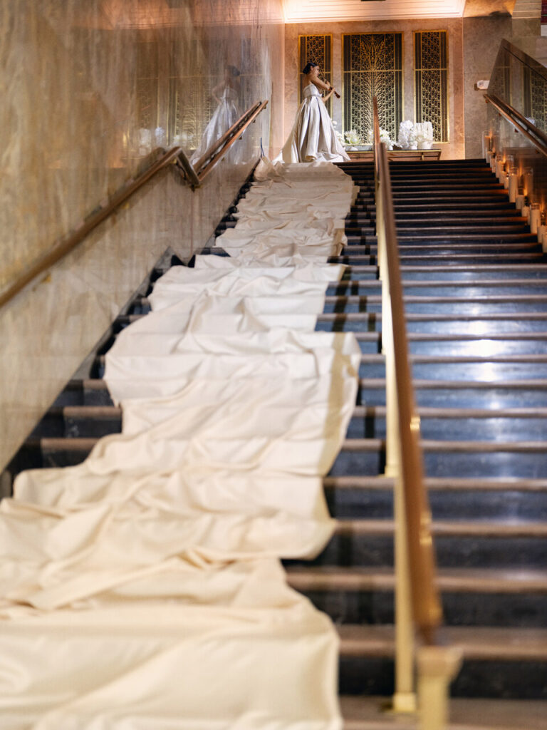 One of the most memorable installations was the cascading fabric along the grand staircase. This dramatic choice reimagined Cloud Dancer as movement — a perfect example of how modern wedding planners and design teams can turn architectural features into showstoppers. It’s a stunning idea for couples searching for unique wedding venues, wedding ballrooms, or ceremony wedding locations that make a lasting impression.