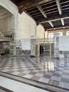 Soft lighting creates a magical ambiance, and nothing achieves that better than candles. Our couples have transformed the aisle with clusters of pillar candles in clear hurricane vases, casting a warm glow that highlights the building’s marble floors and historic walls. The flickering light adds romance and intimacy, making every step feel more special.