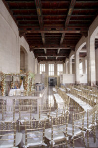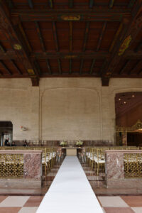 Inspiration Tip: Line the aisle with candles at varying heights for a dramatic effect, complemented by gold accents to tie in with the venue’s Art Deco details.