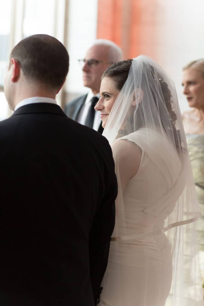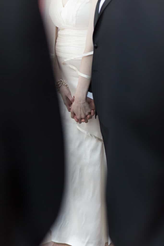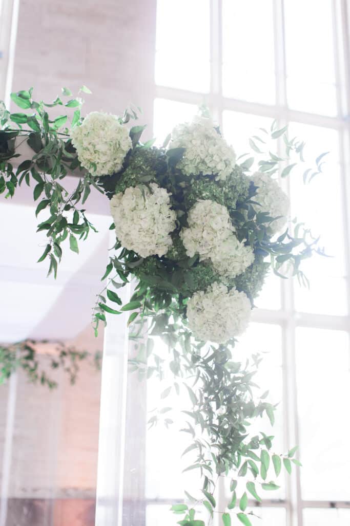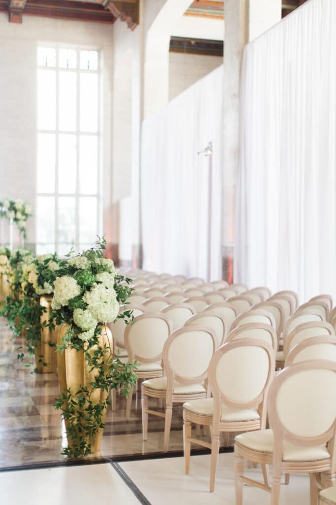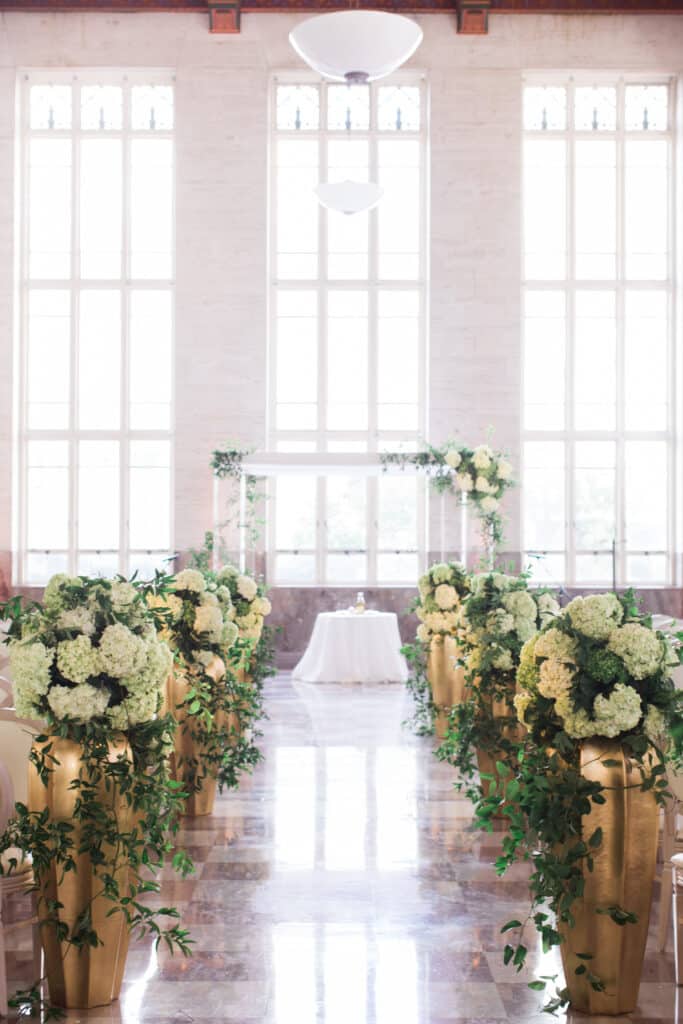 As guests arrived, they were greeted by soaring ceilings, art deco details, and elegant marble floors. The ceremony aisle was lined with dramatic gold vases overflowing with white hydrangeas and lush greenery, creating a romantic path for the couple. Airy white draping and floor-to-ceiling windows bathed the ceremony in natural light, giving the entire setting a fresh, modern vibe perfect for a Miami wedding.