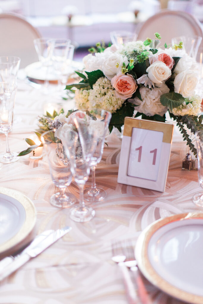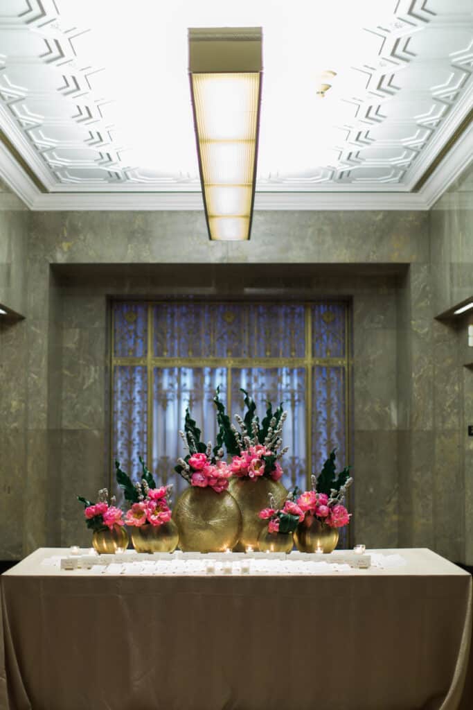 - Floral Highlights: Pink peonies made a statement in grand arrangements, popping against gold vases and mirrored surfaces. These modern yet timeless florals elevated the reception space, adding vibrant color and sophistication.