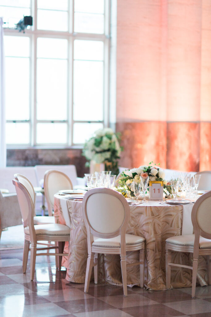 - Unique Accents: Custom table numbers in sleek gold frames, a creative escort card display, and modern lounge areas gave the space a contemporary vibe while staying true to the venue’s classic roots.