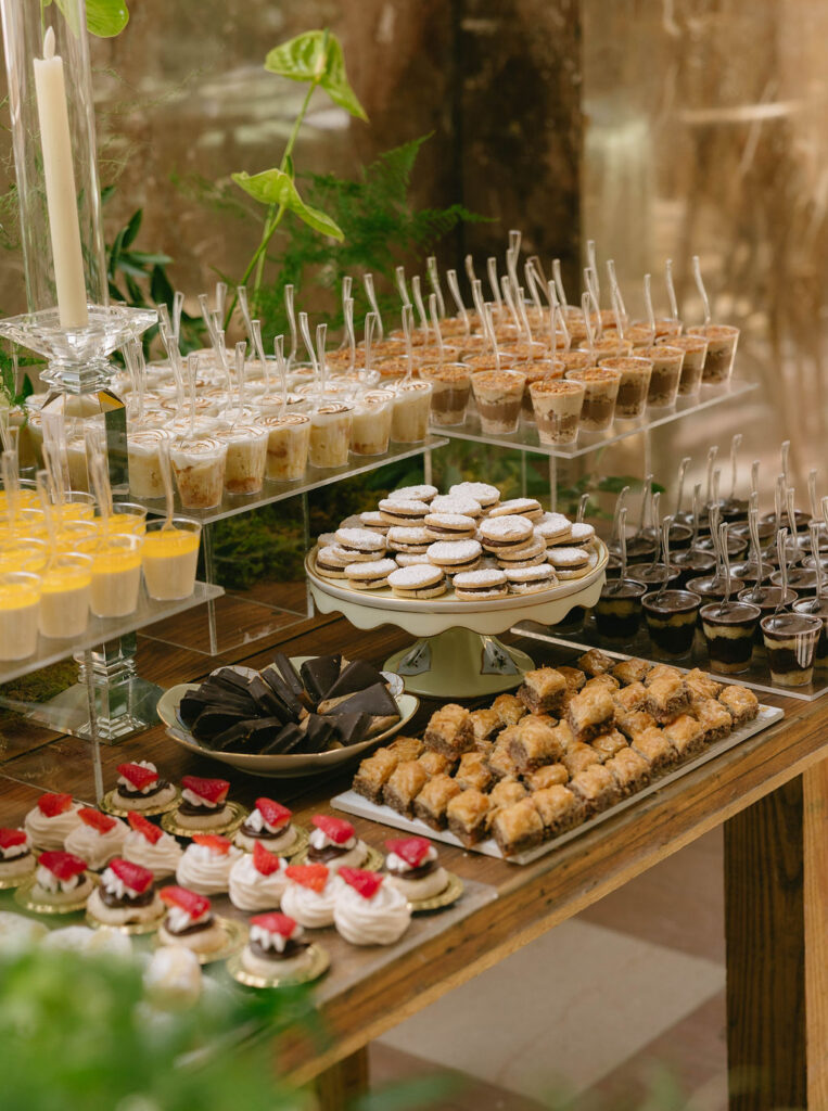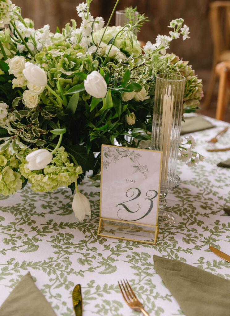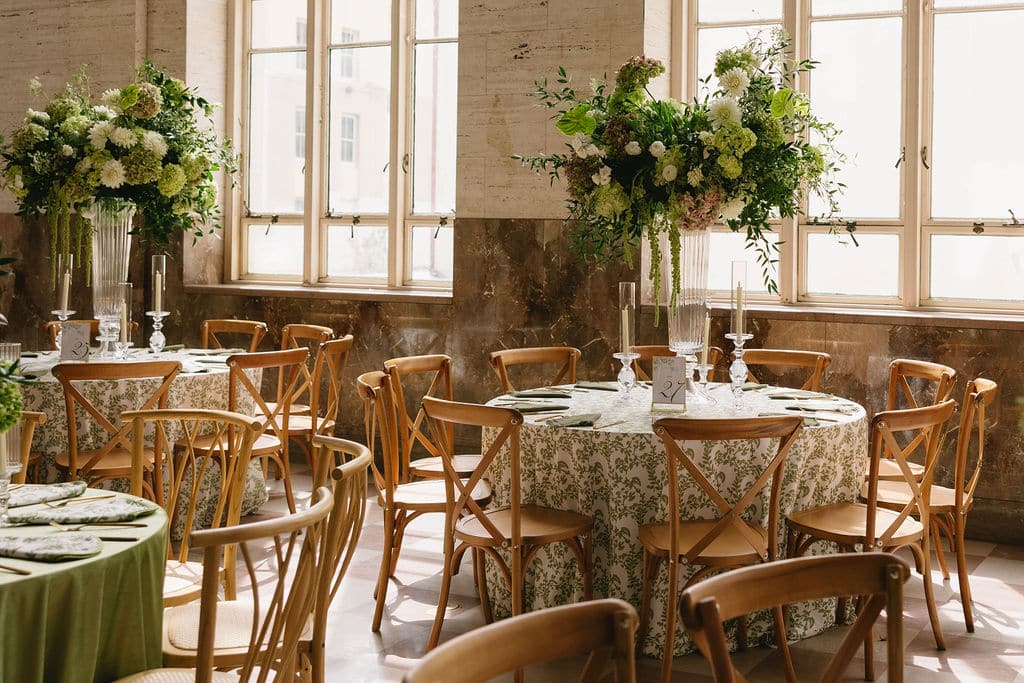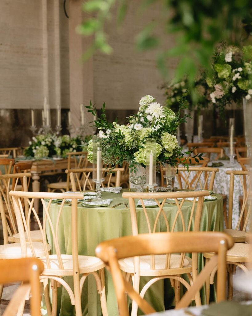 Following the ceremony, the space transformed seamlessly into a warm and inviting reception. Green linens, layered floral centerpieces, candlelight, and natural wood furnishings gave the room a sophisticated garden-inspired atmosphere.