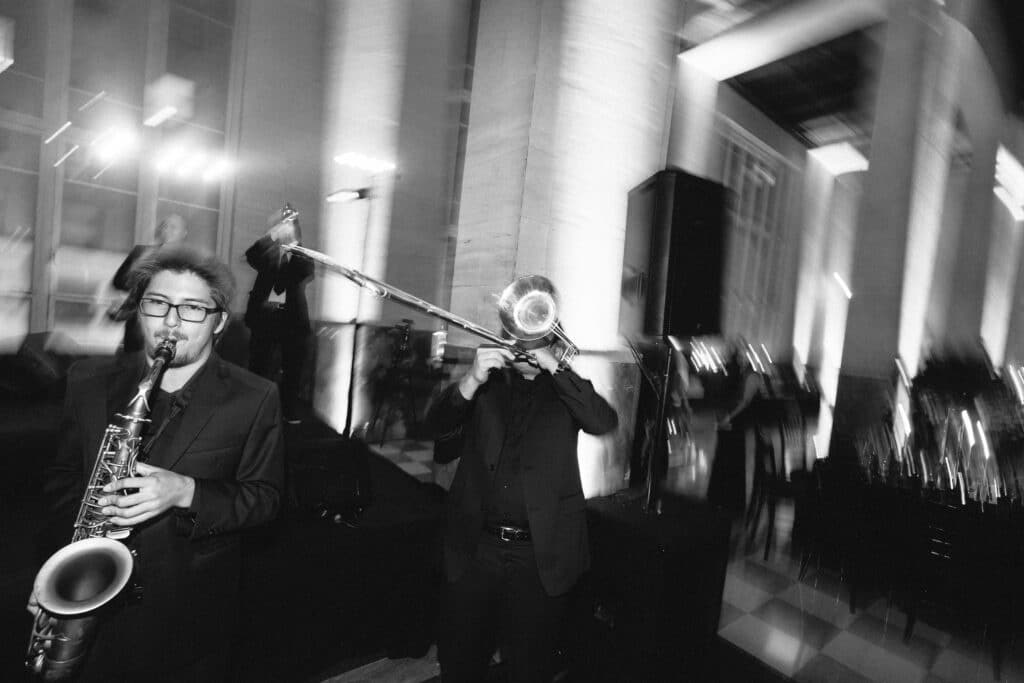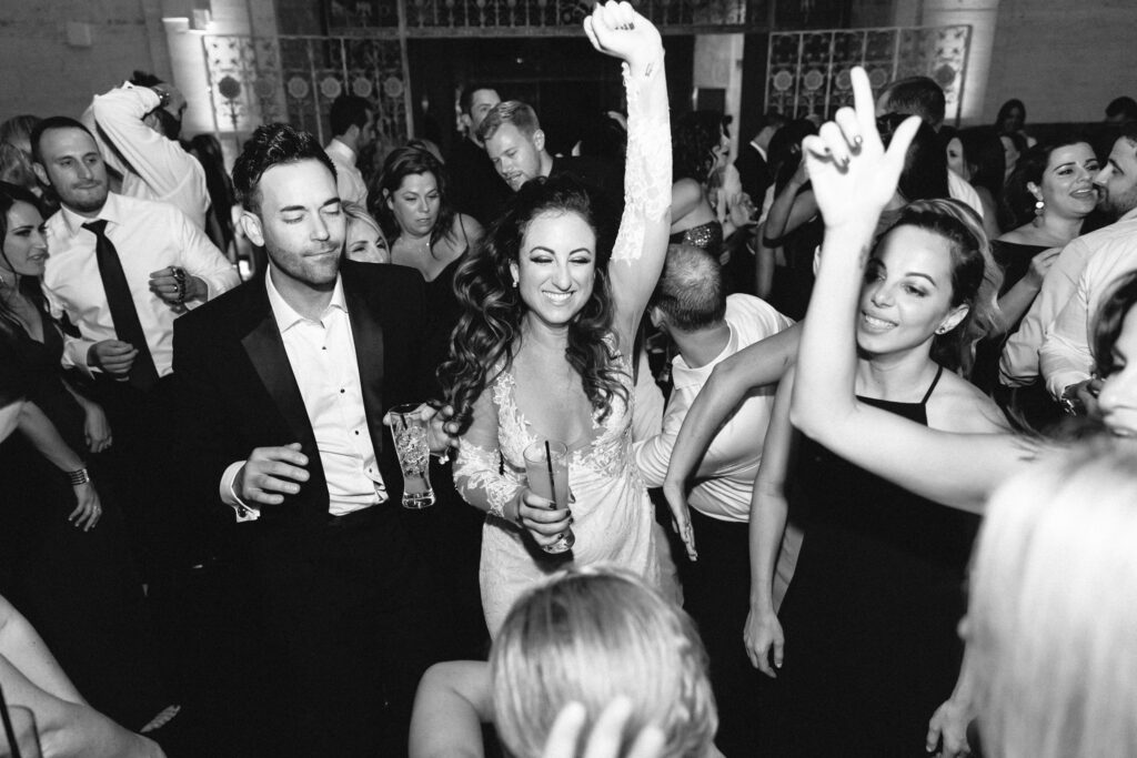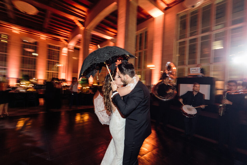 The reception was nothing short of spectacular. A live band kicked off the evening with soulful energy, filling the room with music that carried guests straight to the dance floor. Jamie and Alex shared their first dance beneath the golden glow of the duPont Building’s grand hall, surrounded by loved ones who cheered them on.