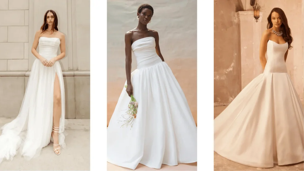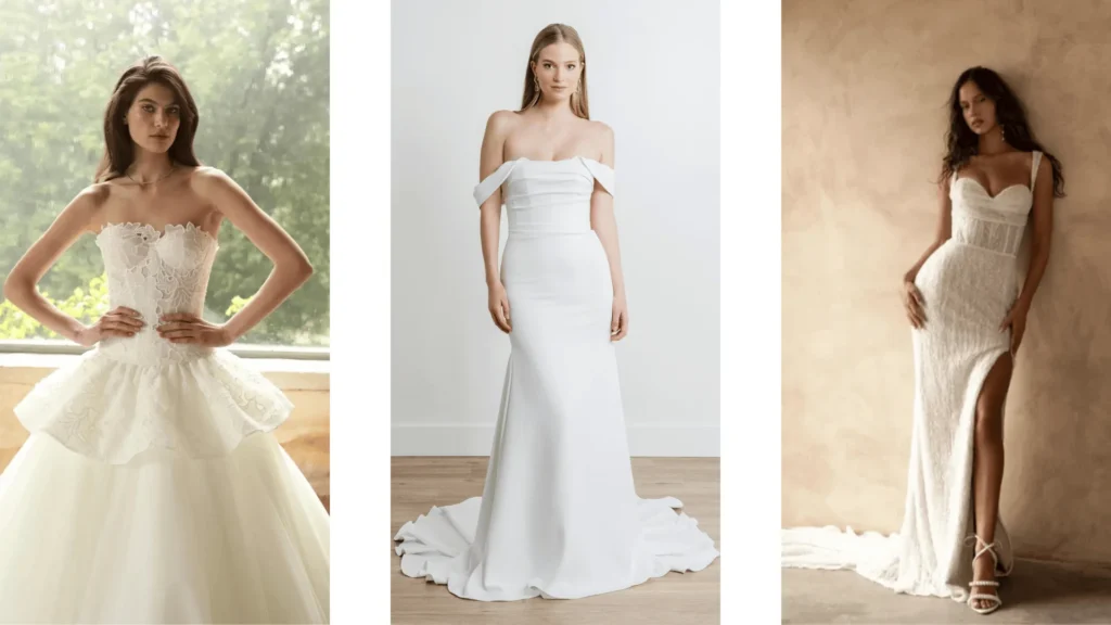 Architectural elements — such as boned corsetry, sculptural hips, and defined basque waists — are trending for brides who want a statement gown with couture presence. These features create flattering silhouettes and are especially striking in photos taken at upscale wedding halls for rent or historical venues like the Alfred I. duPont Building. Inside Weddings.com