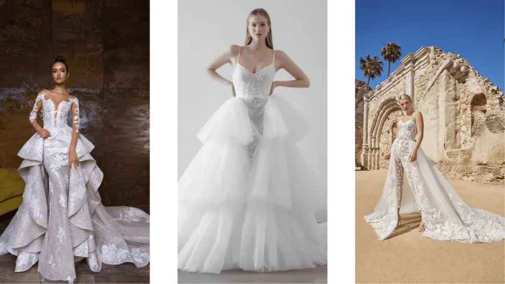 Versatility is in vogue for 2026. Dresses with removable skirts, detachable overskirts, and interchangeable elements allow brides to transform their look between the ceremony and reception — perfect for couples hosting both a dramatic formal affair and a lively wedding party venues event. Who What Wear